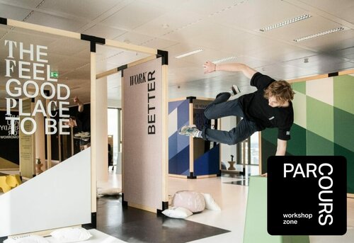 Ein Indoor-Parcours führt durch die Themen Nachhaltigkeit, New Work und Wellbeing. Hier lassen sich die Leitthemen des TOWER185 entdecken – und die Workshopzone bietet den perfekten Rahmen für kreative Meetings und Ideensprints.