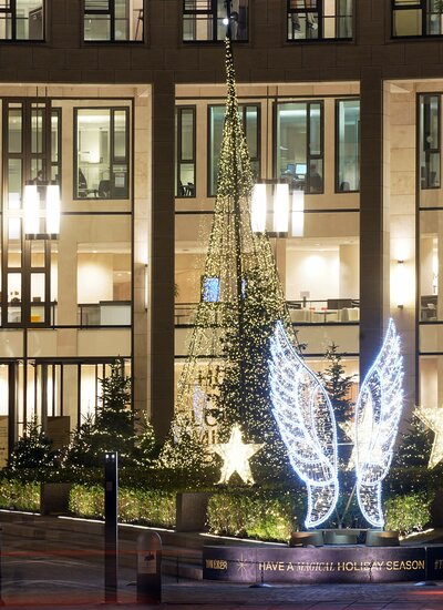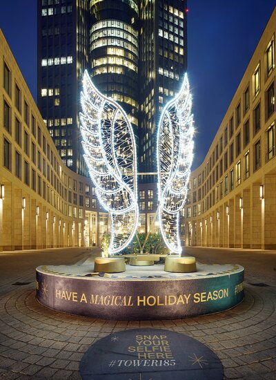 We have thus once again decked out the forecourt of TOWER185 in seasonal style. This time, an illuminated backdrop of angel wings invites you to take special selfies for your personal season’s greetings. The path to the portal is illuminated by winter decorations: stars, a sea of lights, and a shining tree, with the finale being an enchanting fir grove on the round dais. Meanwhile, two festively decorated Christmas trees flank the portal. Naturally, there is a focus on sustainability once again – including the trees in pots and LED lights.