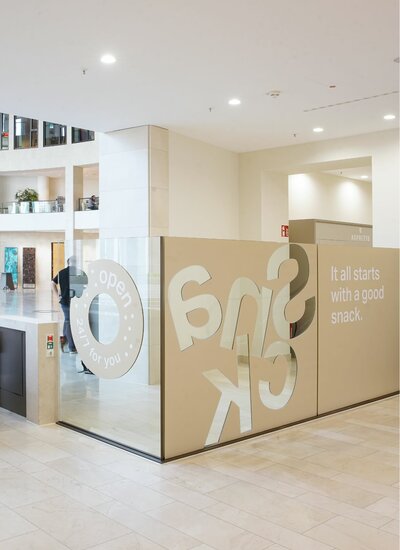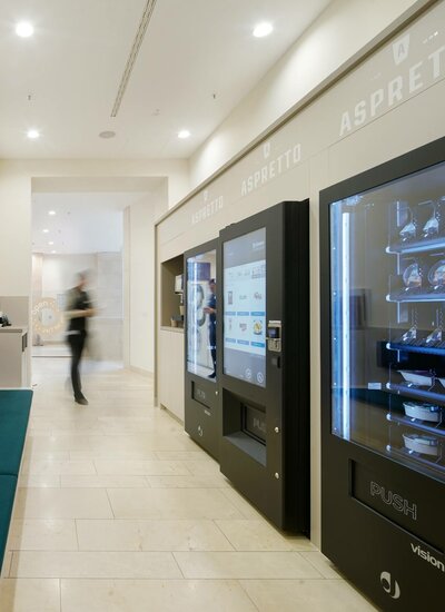 ASPRETTO is synonymous with snacking, and now all employees at TOWER185 can enjoy particularly fresh, balanced snacks to take away. In the specially designed snack corner in the lobby complete with seating, there are now three fully automated food and drink fridges stocked with a high-quality, largely sustainable range of products from regional suppliers, providing varied and healthy refreshments even outside of standard cafeteria opening hours.