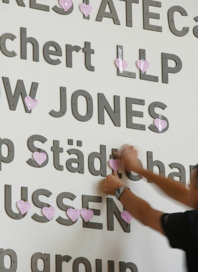 In the wake of Deka Immobilien having successfully signed up additional tenants for TOWER185, it became necessary to make space for the newcomers on the wall in the lobby where all the tenants’ names are displayed. This gave rise to the idea of distributing the magnetic letters to any tenants interested. The TOWER185 team spontaneously invited all employees in TOWER185 to sign up to receive a magnetic letter as their own personal souvenir.