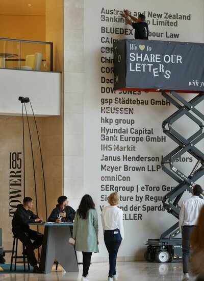 In the context of the provisional redesign of the wall in the lobby displaying the names of all our tenants, the magnetic letters hitherto used on the wall were shared with TOWER185 staff members – the two-day event went by the name of “We love to share our letters with you”.