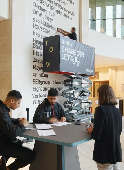 In the form of a small but very special event, on 24 and 25 October the letters were selected and then removed using a lifting platform. The letter hosts then wrote the names of all those interested in taking part on sticker hearts and each heart was then attached to the desired letter. Afterwards, the personal letter bags were placed ready for collection at the reception desk. The event was very well received as almost all the letters soon had new owners and now have a new lease of life as personal It Pieces and TOWER185 souvenirs.