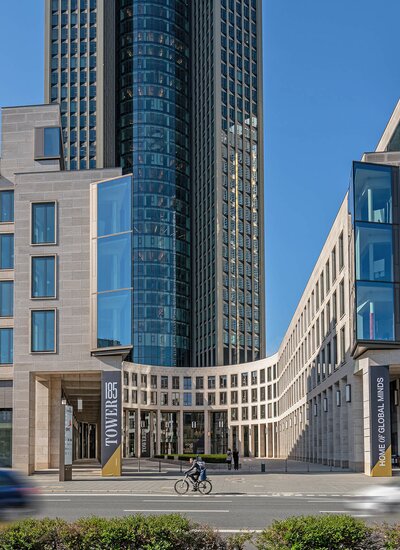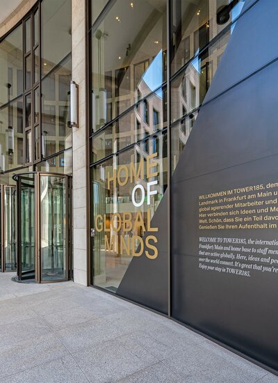 In TOWER185 you can feel at home in both Frankfurt and the world at large. Our new claim – home of global minds – combines global business and the need to feel rooted, positioning TOWER185 as the home base for internationally active staff and corporations alike. The new vertical logo underscores the tower’s importance as the largest high-rise in Germany in terms of gross floor area and as a landmark tower. The timeless font with its serifs symbolizes the tower’s quality and international appeal.