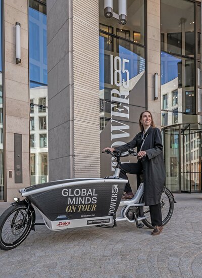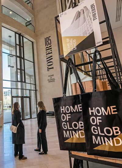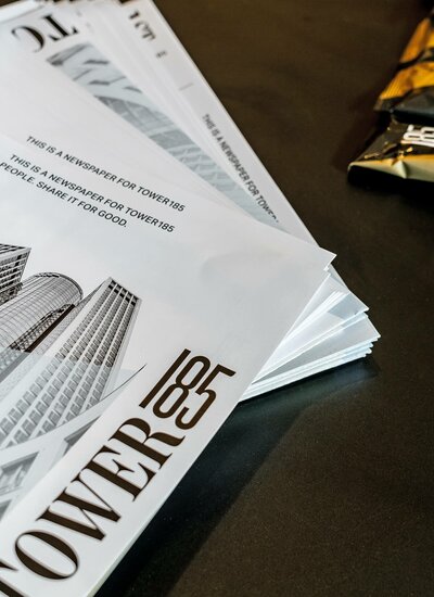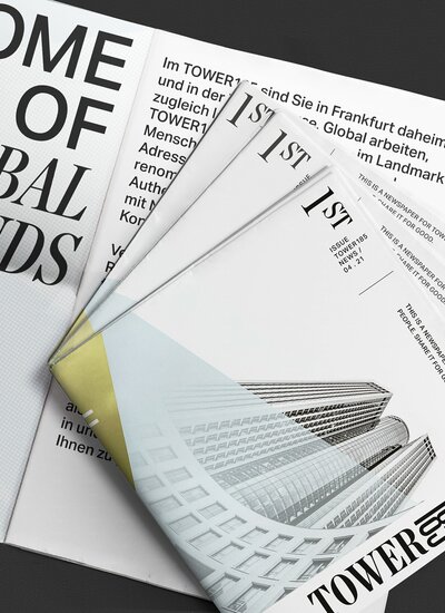 To render the launch of the new brand tangible across a period of three days for staff in the building and those working remotely, the TOWER185 strategy was a mixture of analogue and digital communications: The large-format logo and the claim really caught the eye even as people set foot on the forecourt. Meanwhile, the logo, positioning and mission statement on the entrance portal presented upbeat messages to emphasize the good news. A pop-up kiosk in the lobby distributed small gifts for the tenants and the new TOWER185 magazine – which exclusively offers staff information on new aspects and TOWER185 favourites, appearing in both a print and an online version. The forthcoming novelties were also intimated in advance in the form of a freight bicycle positioned in the lobby and boasting a TOWER185 design. The new website launched to coincide with the rebranding and offers ample space for news, dialogue, and interactivity.
