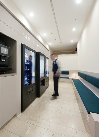ASPRETTO is synonymous with snacking, and now all employees at TOWER185 can enjoy particularly fresh, balanced snacks to take away. In the specially designed snack corner in the lobby complete with seating, there are now three fully automated food and drink fridges stocked with a high-quality, largely sustainable range of products from regional suppliers, providing varied and healthy refreshments even outside of standard cafeteria opening hours.